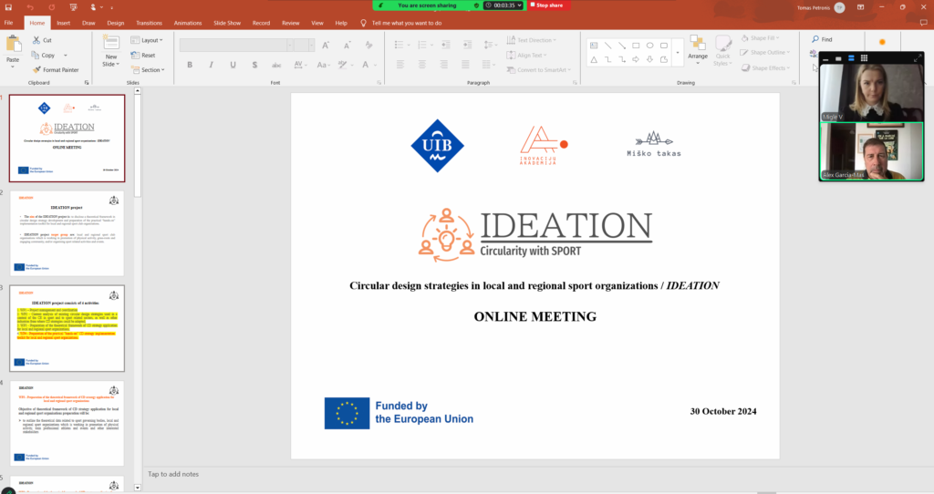 2024 m. spalio 31 d. Erasmus+ sporto projekto IDEATION partneriai susitiko pristatyti sukurtą teorinę židinio dizaino (CD) strategijų sistemą, specialiai pritaikytą vietinėms ir regioninėms sporto organizacijoms. Ši visapusiška sistema skirta padėti sporto organizacijoms integruoti žiedinės ekonomikos (CE) principus į savo veiklas, nesvarbu, ar tai mažos bendruomenės sporto komandos, ar didelės regioninės organizacijos.
